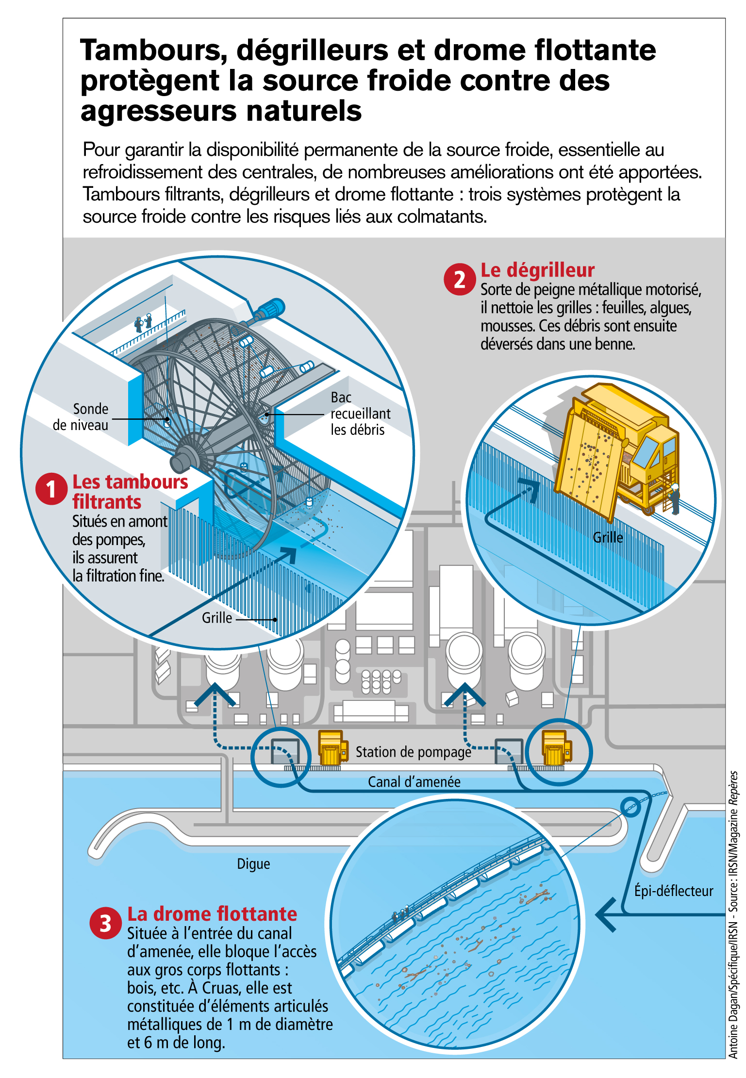 INFOGRAPHIE - Tambours, dégrilleurs et drome flottante protègent la source froide contre des agresseurs naturels