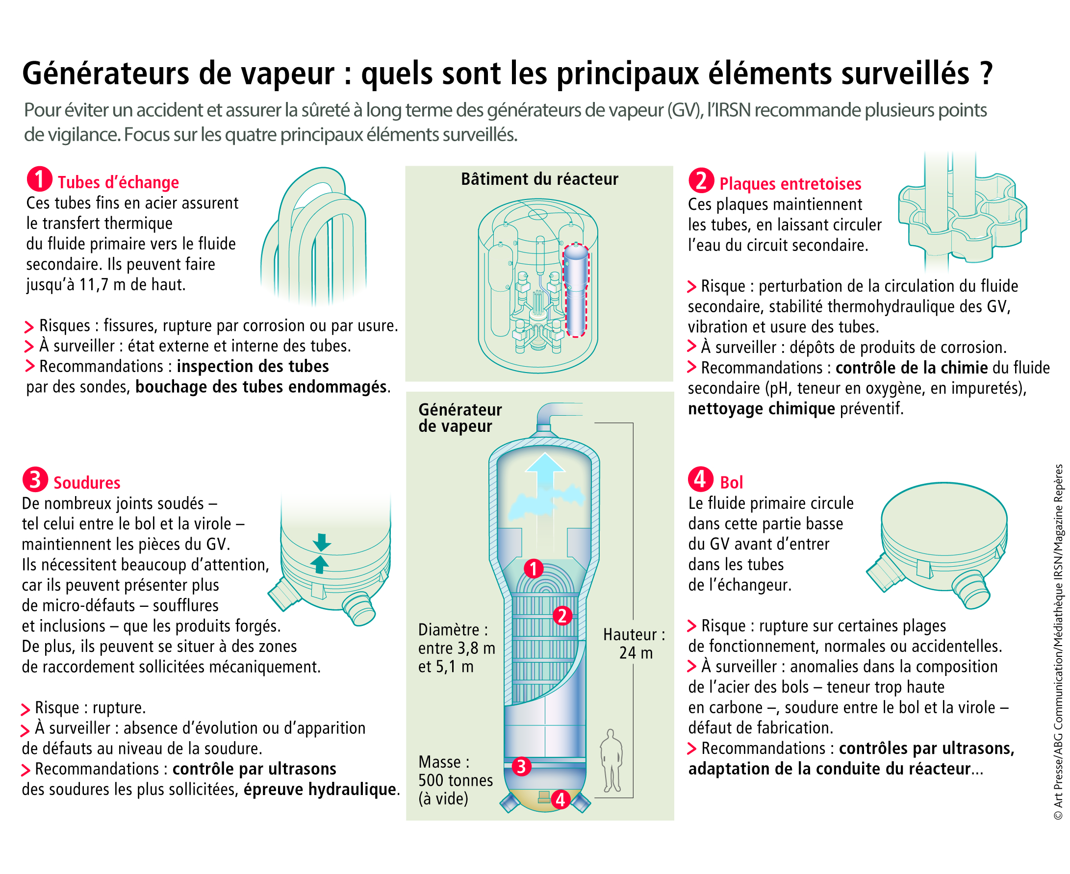 Pour éviter un accident et assurer la sûreté à long terme des générateurs de vapeur (GV), l'IRSN recommande plusieurs points de vigilance. Focus sur les quatre principaux éléments surveillés.