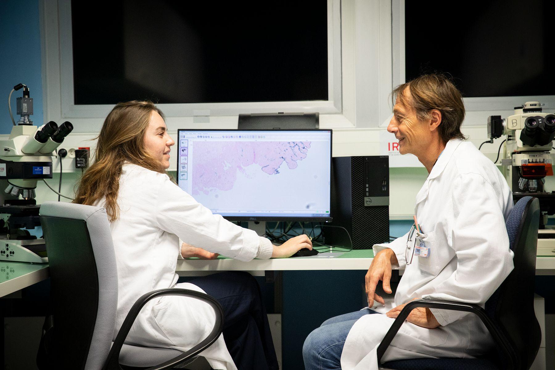 Ses résultats sont supervisés par le radiobiologiste Alain Chapel (à droite). Il dirige cette thèse visant à étudier le traitement par cellules souches mésenchymateuses, des inflammations chroniques causées par les radiothérapies pelviennes. © Célia Goumard/Médiathèque IRSN