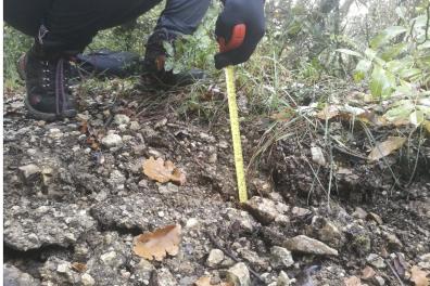 Deux jours après le séisme survenu au Teil (Ardèche), les géologues de l’IRSN cartographient et mesurent les déformations, comme ici un décalage vertical de 15 à 20 cm. Un phénomène observé en surface pour la première fois en France métropolitaine. - © Stéphane Baize / IRSN