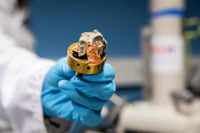 Comment les bétons de scellement seront-ils dégradés au fil du temps par l’eau présente dans la roche ? Pour le prévoir, les minéraux de cet échantillon sont analysés au microscope électronique à balayage - © Philippe Dureuil/Médiathèque IRSN