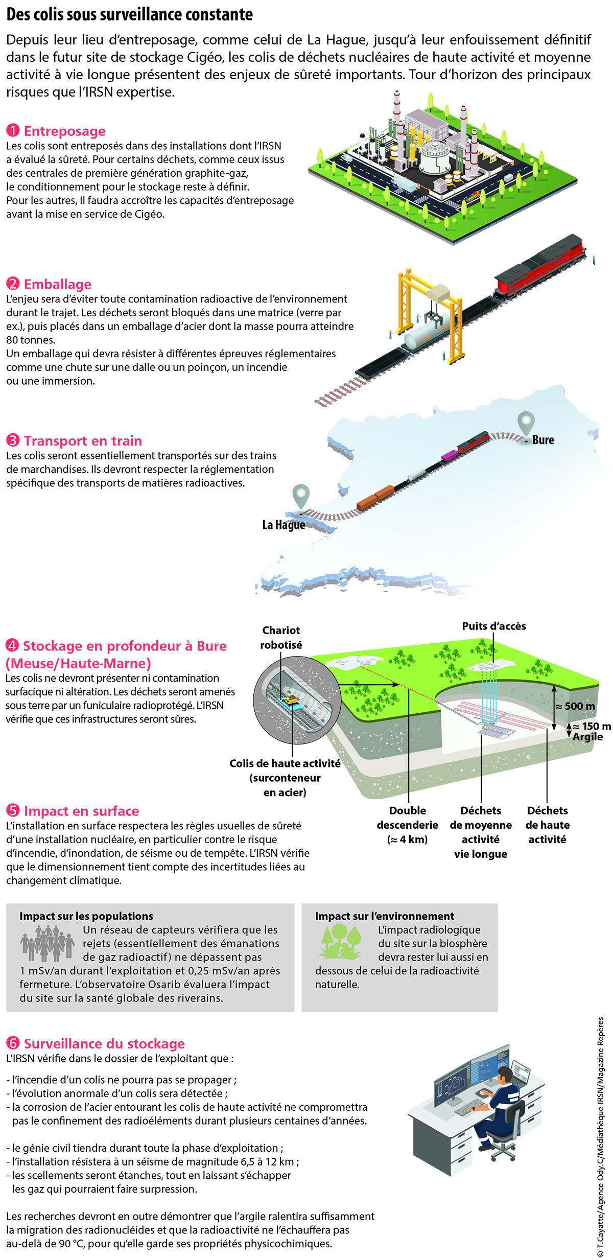 Depuis leur lieu d’entreposage, comme celui de La Hague, jusqu’à leur enfouissement définitif dans le futur site de stockage Cigéo, les colis de déchets nucléaires de haute activité et moyenne activité à vie longue présentent des enjeux de sûreté importants. Tour d’horizon des principaux risques que l’IRSN expertise.