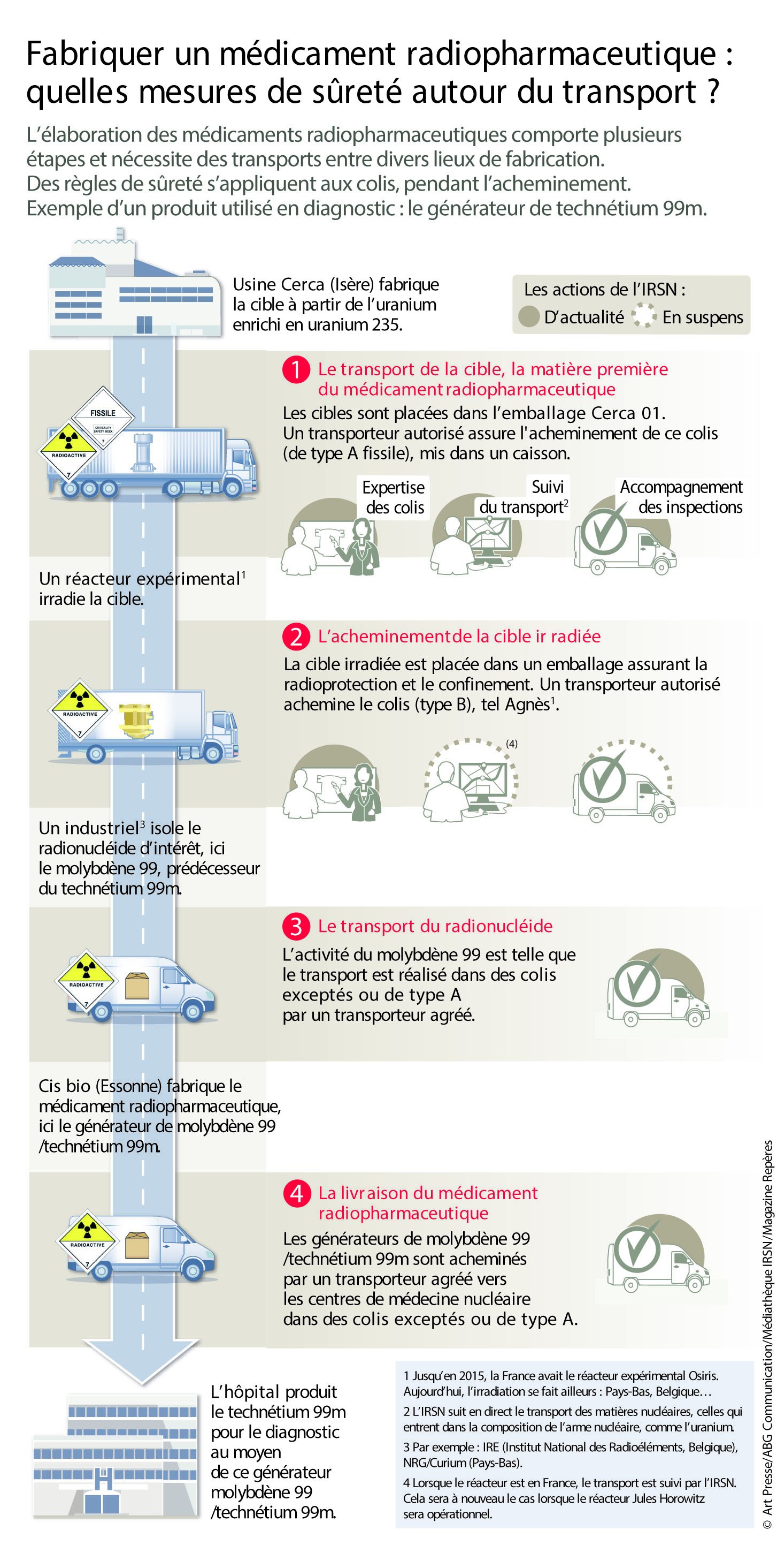 L'élaboration des médicaments radiopharmaceutiques comporte plusieurs étapes et nécessite des transports entre divers lieux de fabrication. Des régles de sûreté s'appliquent aux colis pendant l'acheminement. Exemple d'un produit utilisé en diagnostic : le générateur de technétium 99.