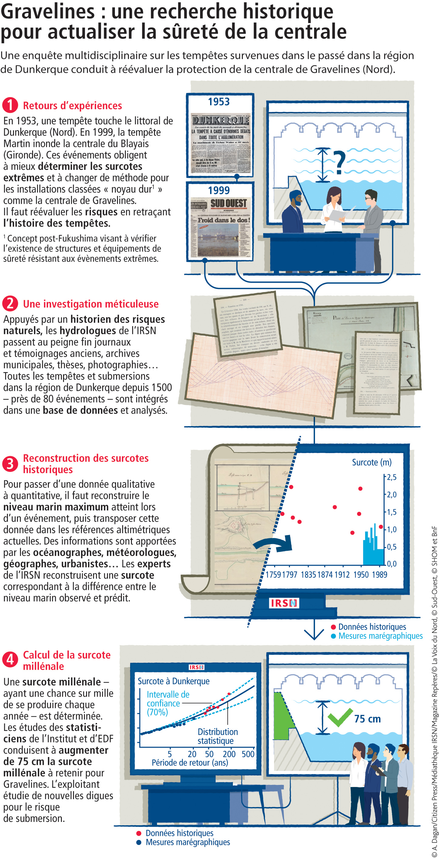 Lorsqu’ils vérifient que les dispositions retenues sont suffisantes pour protéger les installations, les chercheurs gagnent en robustesse et en fiabilité. Pour améliorer la solidité statistique, le contexte régional est pris en compte. Nathalie Giloy, chercheuse en environnement littoral, complète : « Nous veillons à recueillir des données antérieures à l’installation des marégraphes dans les années 1950. » Pour la centrale de Gravelines, elle a fouillé dans l’histoire hydrométéorologique de Dunkerque (voir infographie), conduisant à une réévaluation de la surcote extrême.