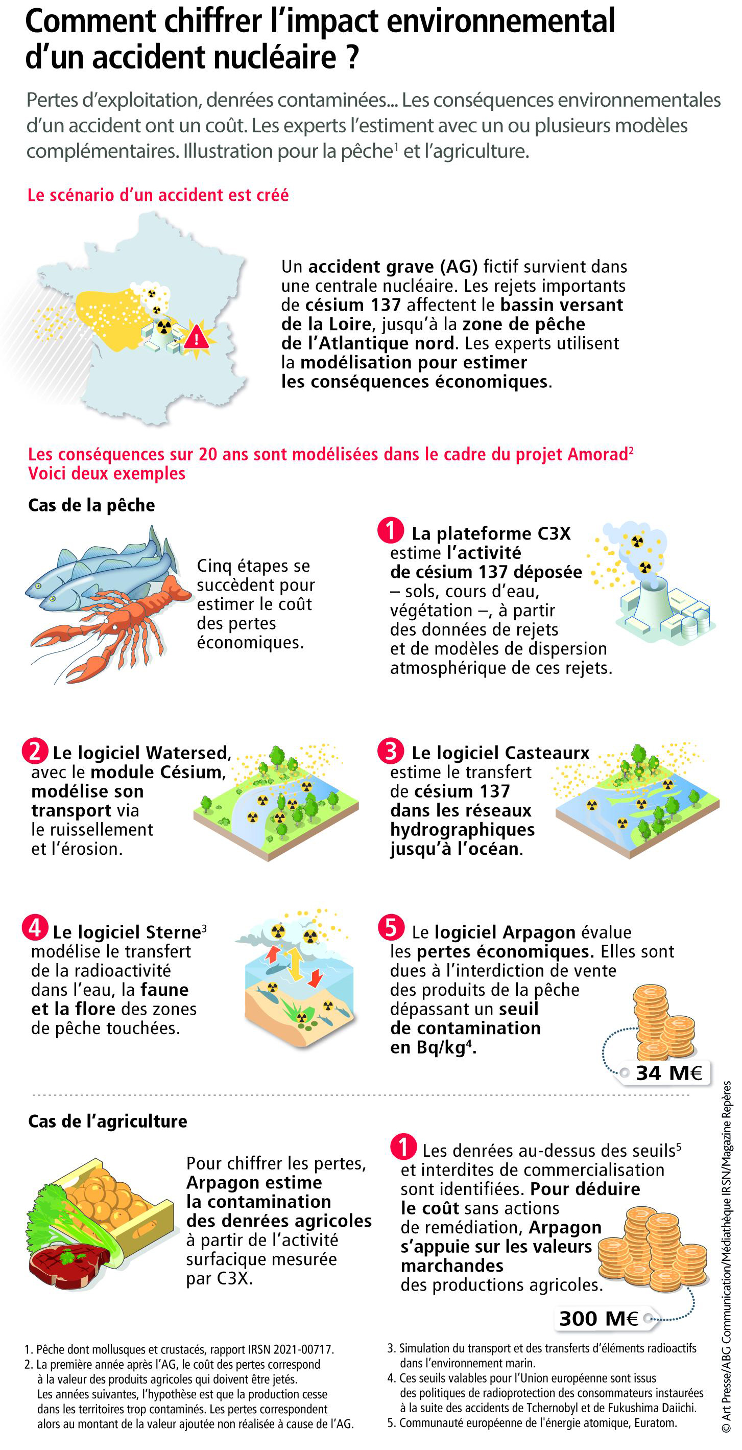 Pertes d'exploitation, denrées contaminées... Les conséquences environnementales d'un accident nucléaire ont un coût. Les experts l'estiment avec un ou plusieurs modèles complémentaires. Illustration pour la pêche et l'agriculture.