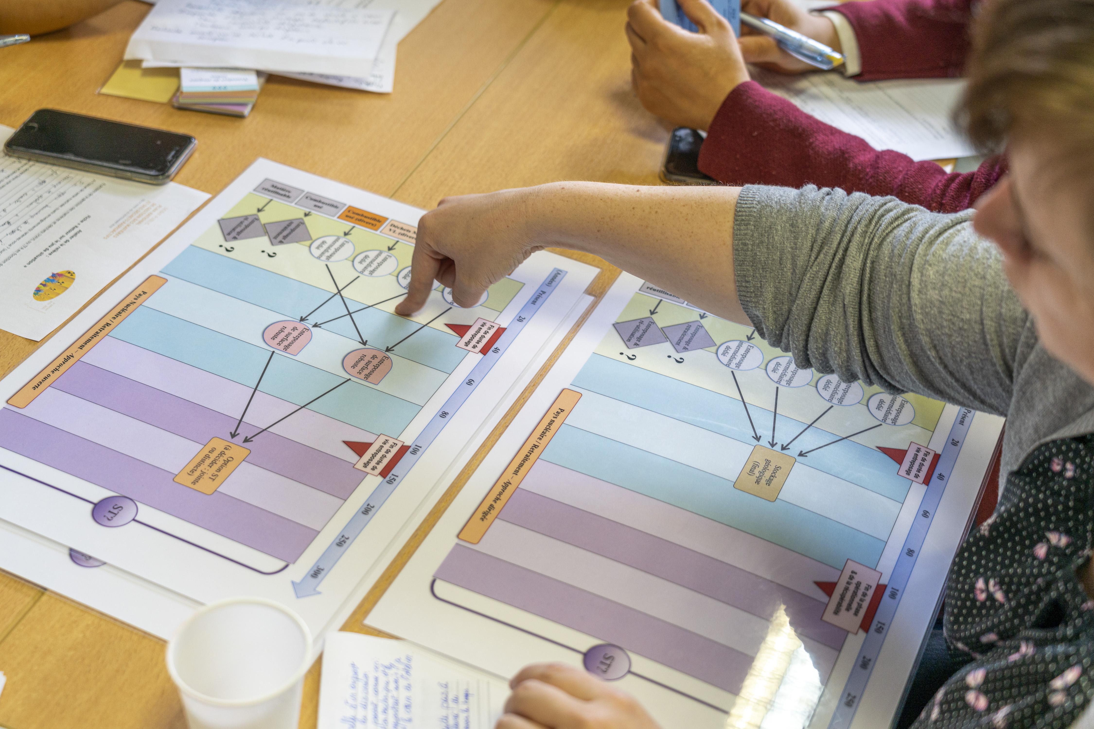 Léa construit son scénario en posant des cartes sur un plateau : « Dans cinquante ans, nous sommes dans une phase de stockage intermédiaire et une galerie souterraine s’effondre. » À tour de rôle, ses voisins évaluent l’impact de la situation. À l’issue de la partie, les points de vue se confrontent. Pour Angelo, il faut aller rapidement vers le stockage géologique profond. D’autres estiment plus sage d’attendre pour laisser des alternatives émerger grâce à la recherche. Les joueurs sont unanimes sur la nécessité d’une solution réversible : « Pas question de fermer définitivement la porte avec du ciment. Nous ne sommes plus dans les années 1970 », s’exclame Yasar.