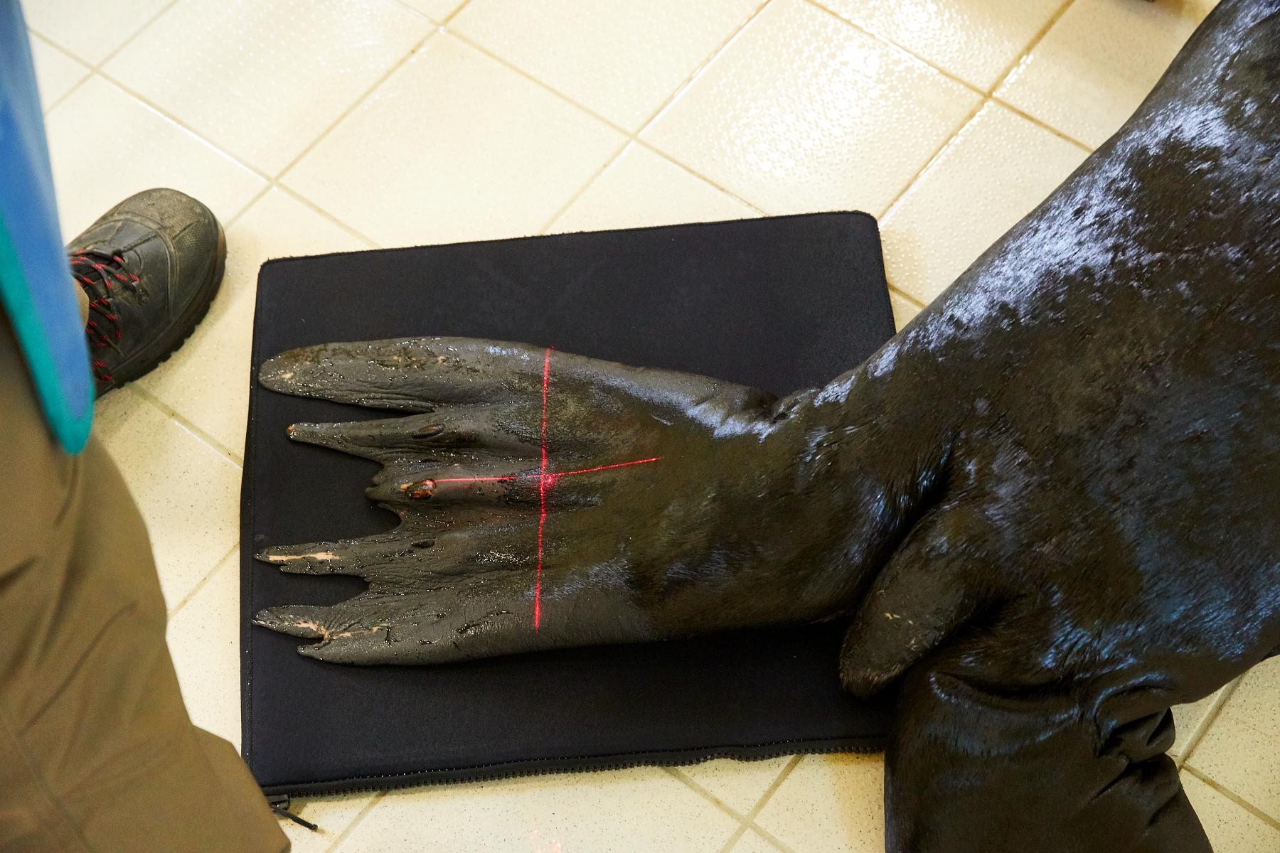 Protégé par une housse noire, le capteur wi-fi est installé sous la nageoire de l’otarie Black. Pour limiter l’exposition, et ne toucher que l’animal, le tir se fait à la verticale. La croix rouge permet d’ajuster la position du faisceau. À proximité, Chloé Martin, soigneuse, contrôle et calme l’animal. Obligée de rester dans la zone surveillée, Chloé porte une tenue plombée et un dosimètre.