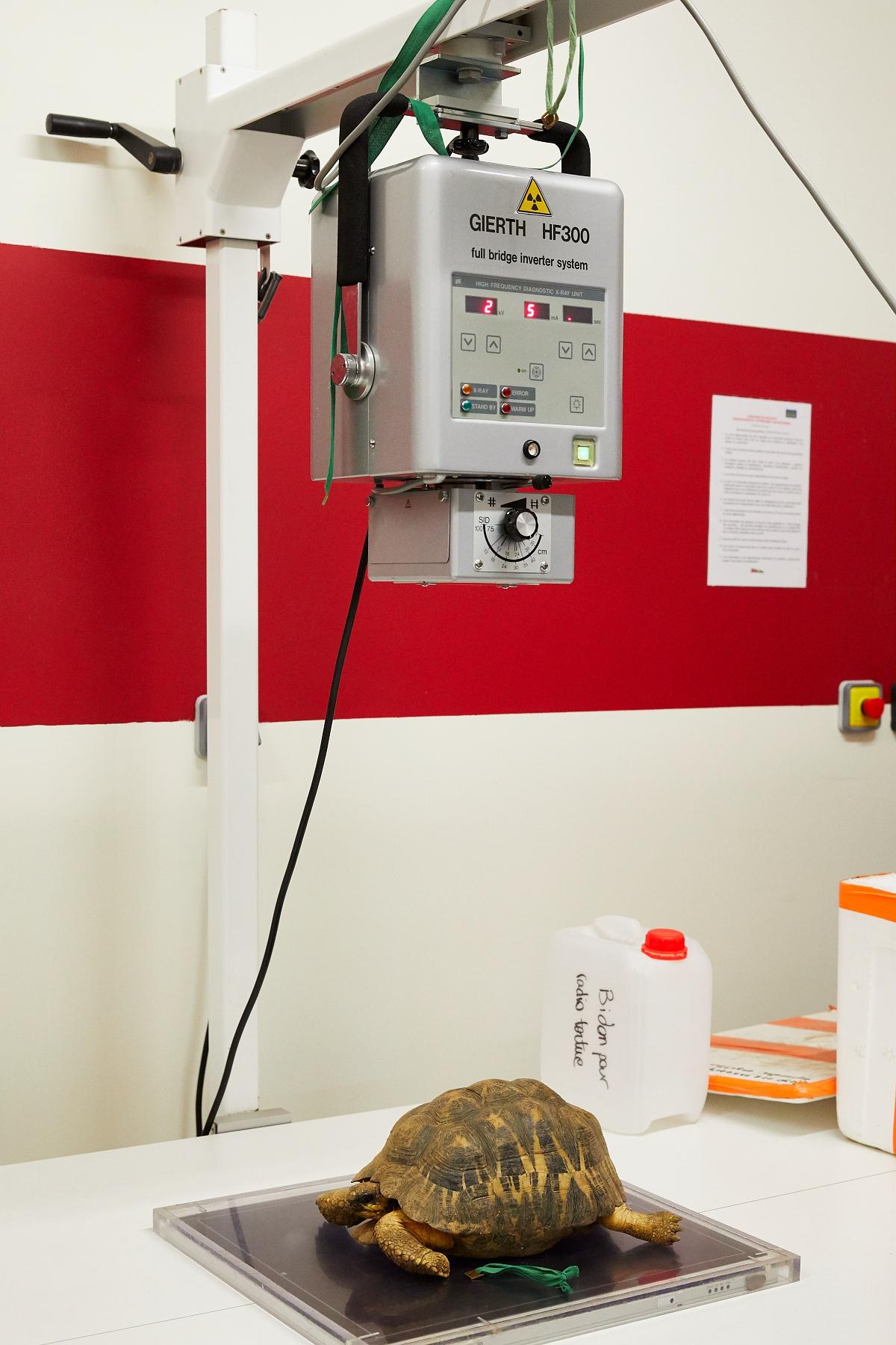 Pour le premier cliché, la tortue est d’abord posée sur le capteur. Le générateur de rayons X est installé en position verticale afin de réduire la surface d’exposition et ne toucher que l’animal.