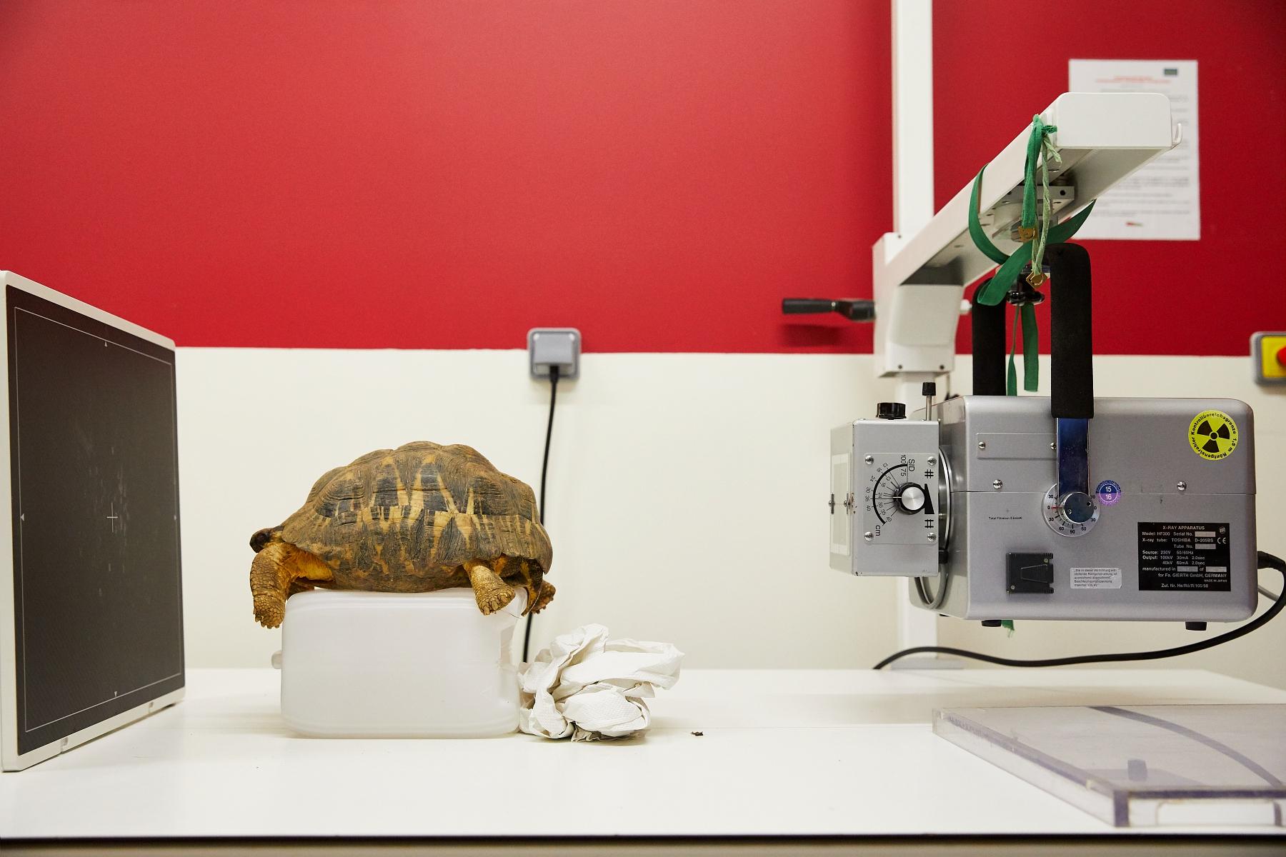 Les petits animaux à radiographier sont amenés à la clinique. Afin de limiter leur stress, ils sont transportés dans des boîtes fermées. Ici, une tortue mâle.