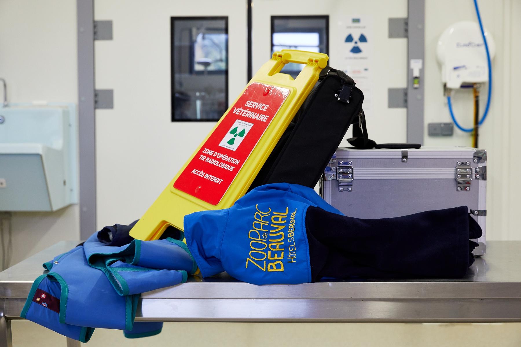 Une fois l’entraînement de l’otarie terminé, les vétérinaires endossent leurs combinaisons plombées dans le hall d’entrée du bâtiment. Ils s’équipent également de dosimètres.