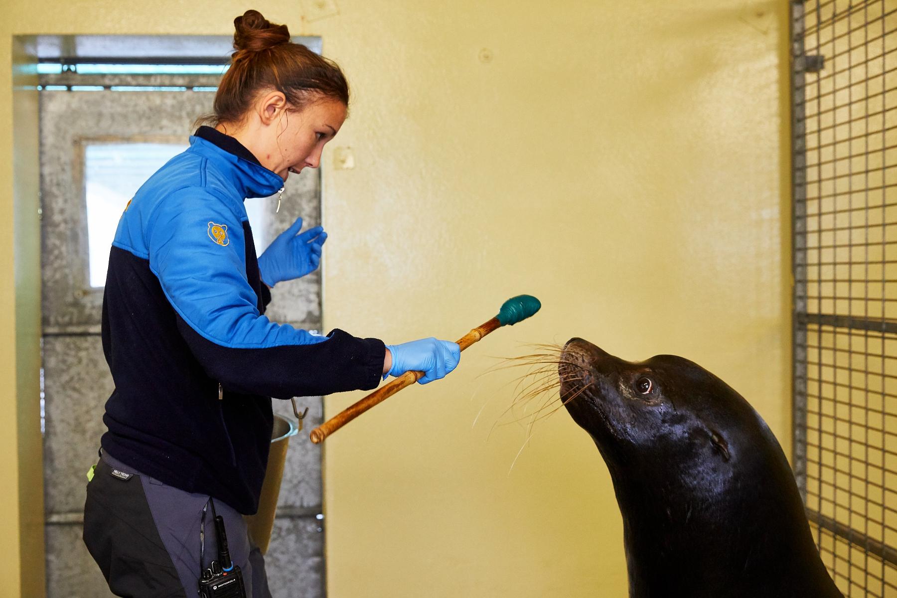 Avant d’installer l’équipement de radiographie, Chloé Martin, une des soigneuses en charge des otaries, acclimate l’animal. Le bâton à bout en mousse permet de focaliser son attention.