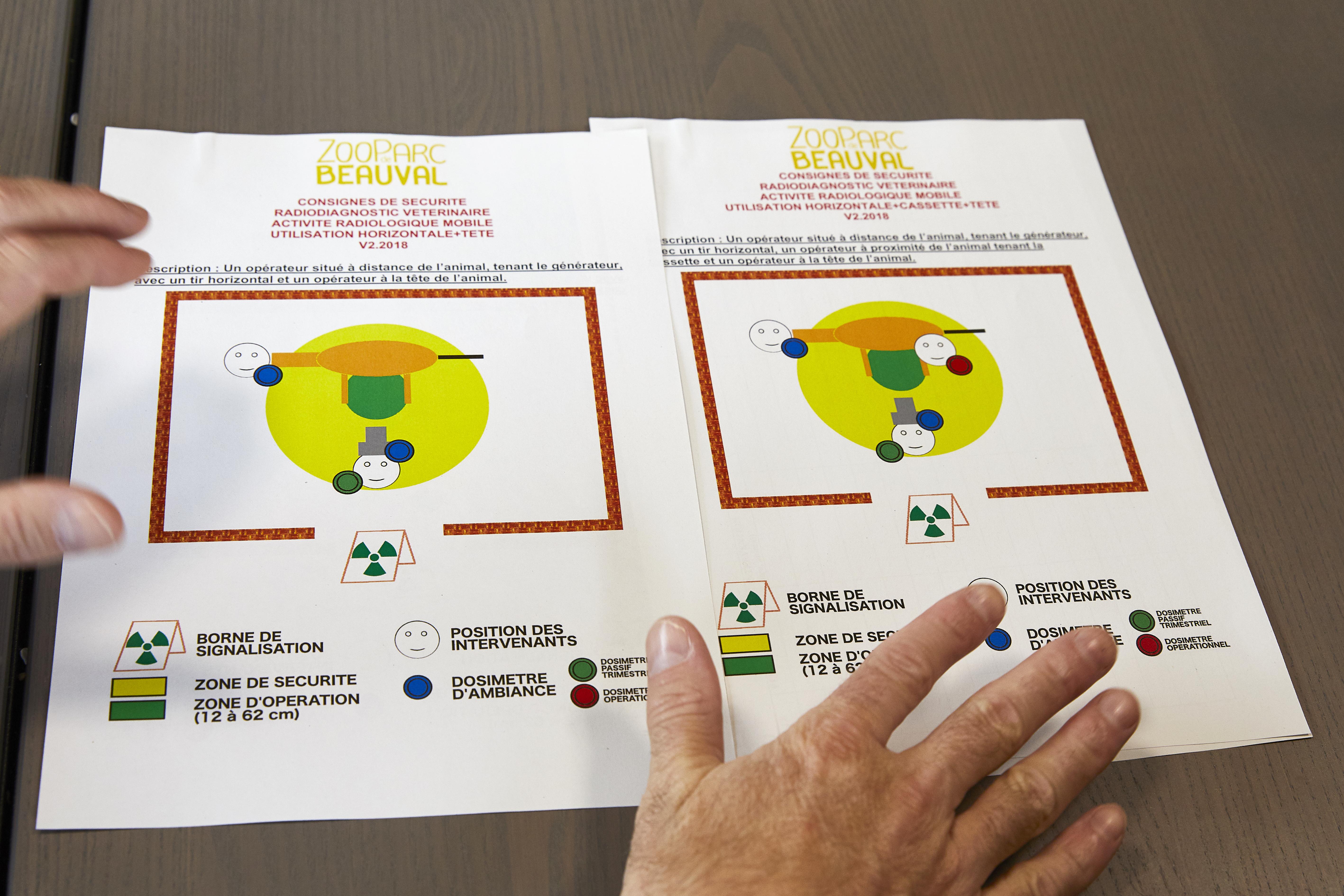 Le dossier de radioprotection est nécessaire au suivi des professionnels, à leur formation et aux discussions avec les autorités. Il contient les évaluations dosimétriques et décrit les contextes d’intervention (ici l’animal à radiographier est représenté en orange). Pour chaque situation il précise les consignes et l’équipement requis.