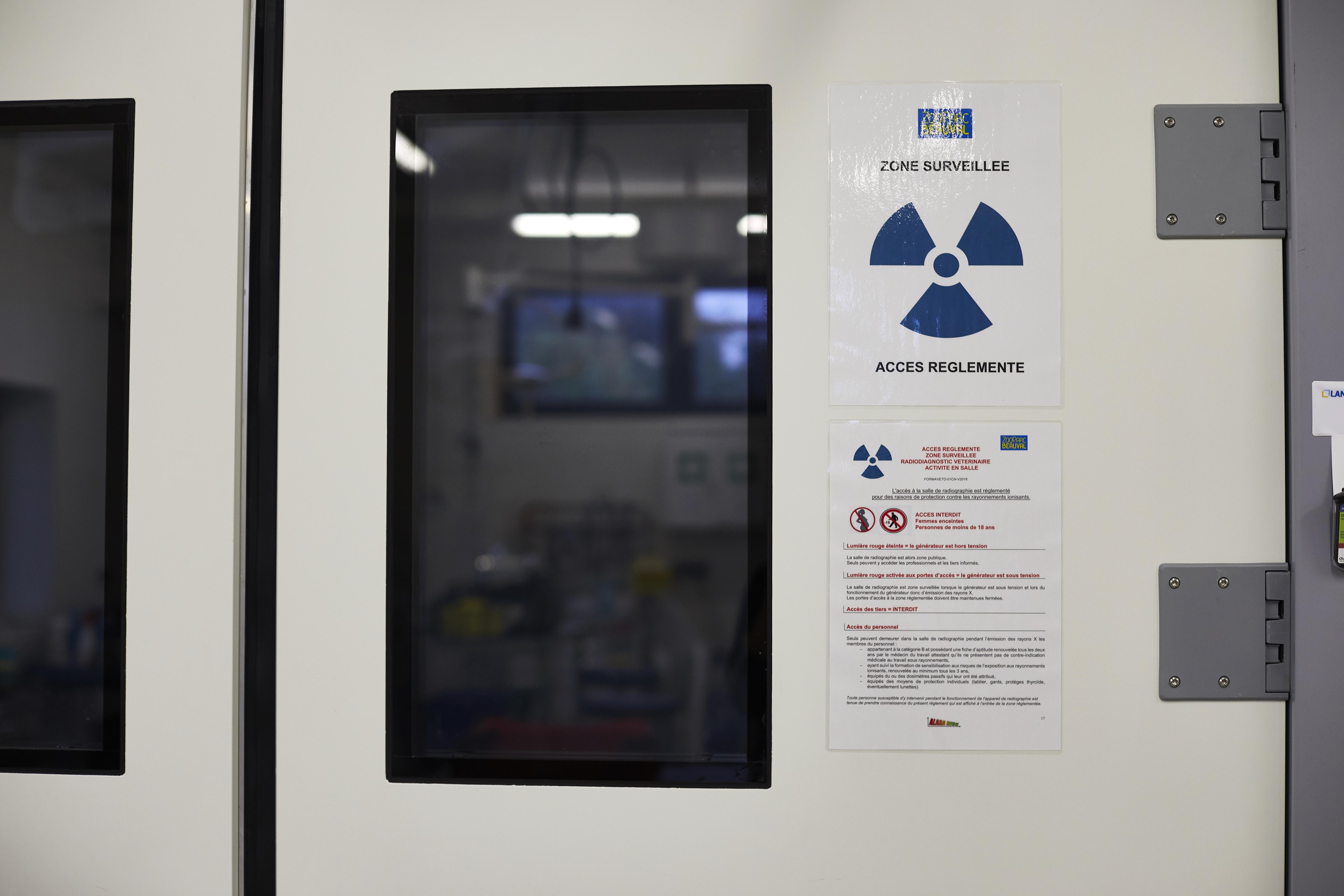 Le ZooParc de Beauval dispose d’un scanner. Il peut accueillir des patients jusqu’à 200 kilogrammes. Au-dessus de la porte d’entrée, des lumières rouge et blanche indiquent s’il est en fonctionnement. Toute ouverture des portes durant l’utilisation coupe immédiatement le générateur. Le personnel opère depuis une salle de contrôle plombée située dans une pièce adjacente.