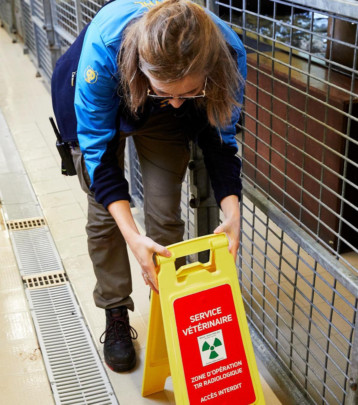 Avant d’aller dans le bâtiment des otaries, les vétérinaires préparent le matériel mobile : panneau de zonage, caisse métallique contenant le générateur mobile, équipements de radioprotection.
