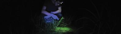 La nuit, les rainettes mâles chantent pour attirer les femelles. Clément Car, doctorant à l’IRSN jusqu'en juin 2023, tend l’oreille pour les capturer. - © Jean-Marc Bonzom/IRSN jusqu'en juillet 2024