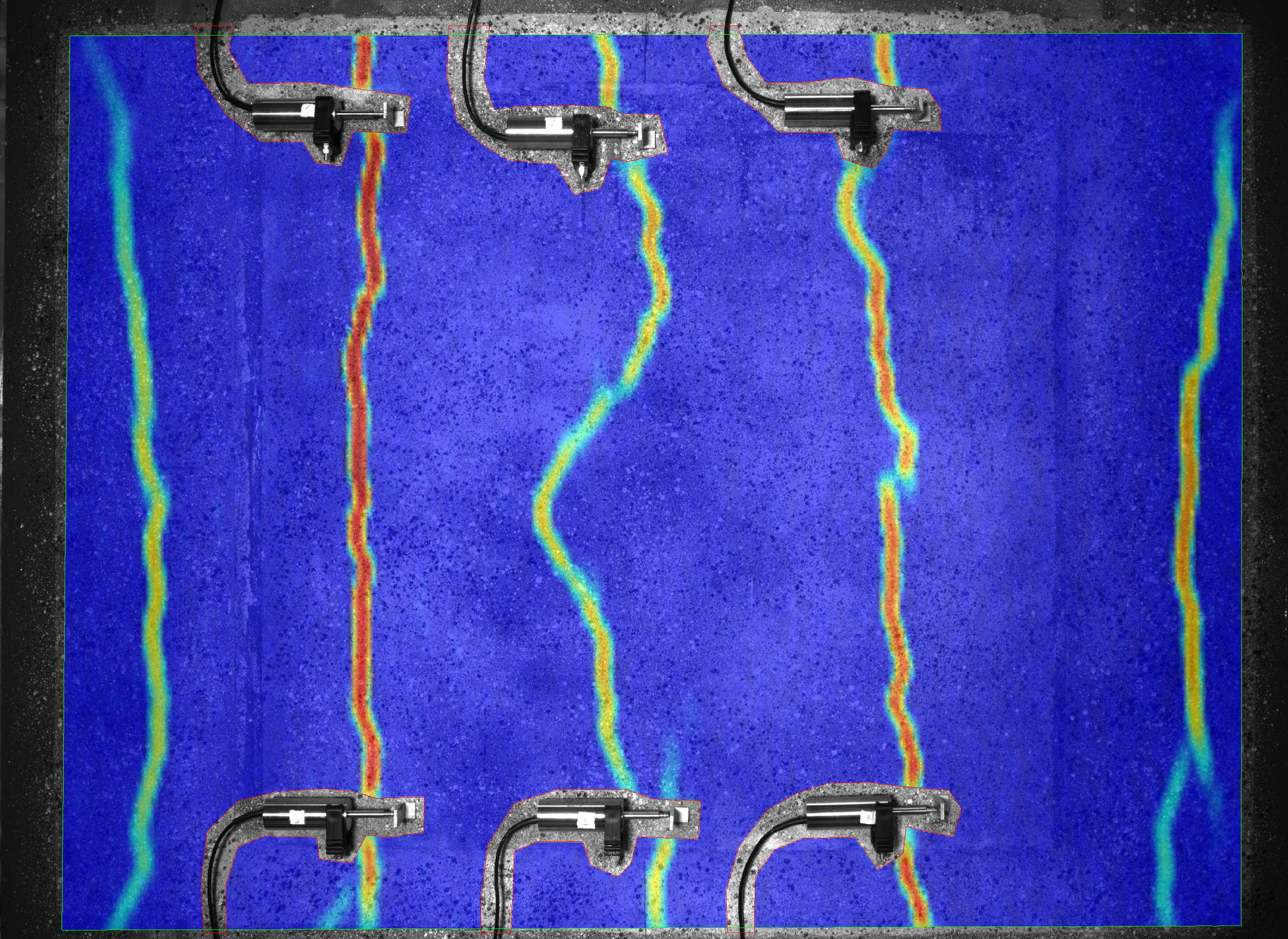 L’échelle de couleur – du bleu au rouge – représente la valeur des déplacements relatifs mesurés dans la direction de l’effort de traction au moment de la photo, ici en illustration, par rapport à la photo de référence initiale, révélant ces fissures dont l’ouverture varie de 0,20 à 0,35 millimètre.