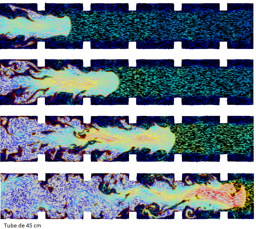 Un Van Gogh retrouvé dans le grenier d’un particulier ? Non, ce visuel est la simulation numérique d’une explosion de méthane injecté dans un tube contenant des obstacles qui favorisent le mélange du gaz. Image après image, on distingue un front de flamme qui avance et accélère du fait de la turbulence engendrée par l’écoulement dans le sillage des obstacles. Plus les couleurs tendent vers le rouge, plus le gaz se déplace vite.
